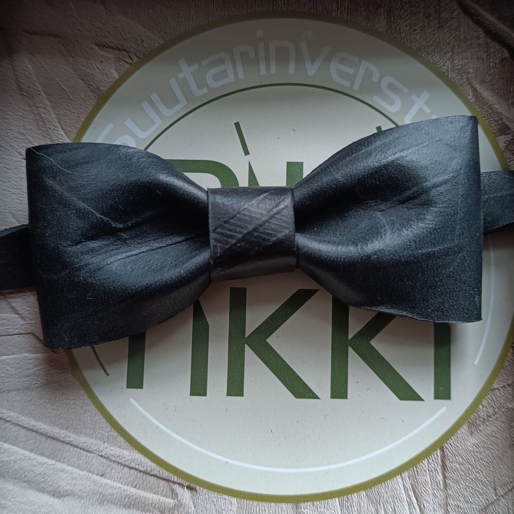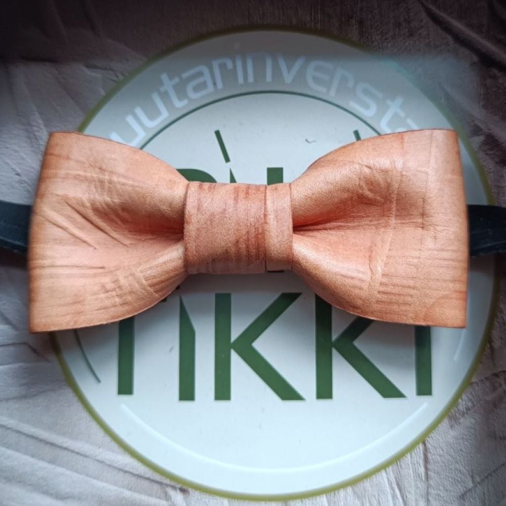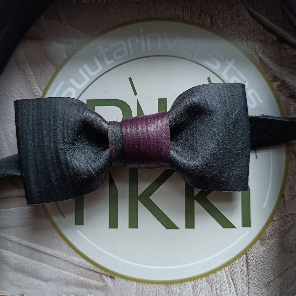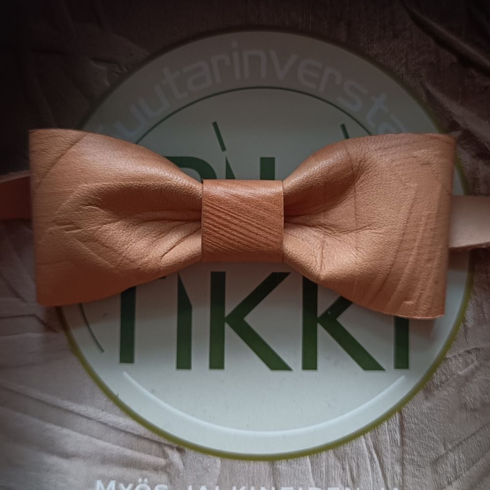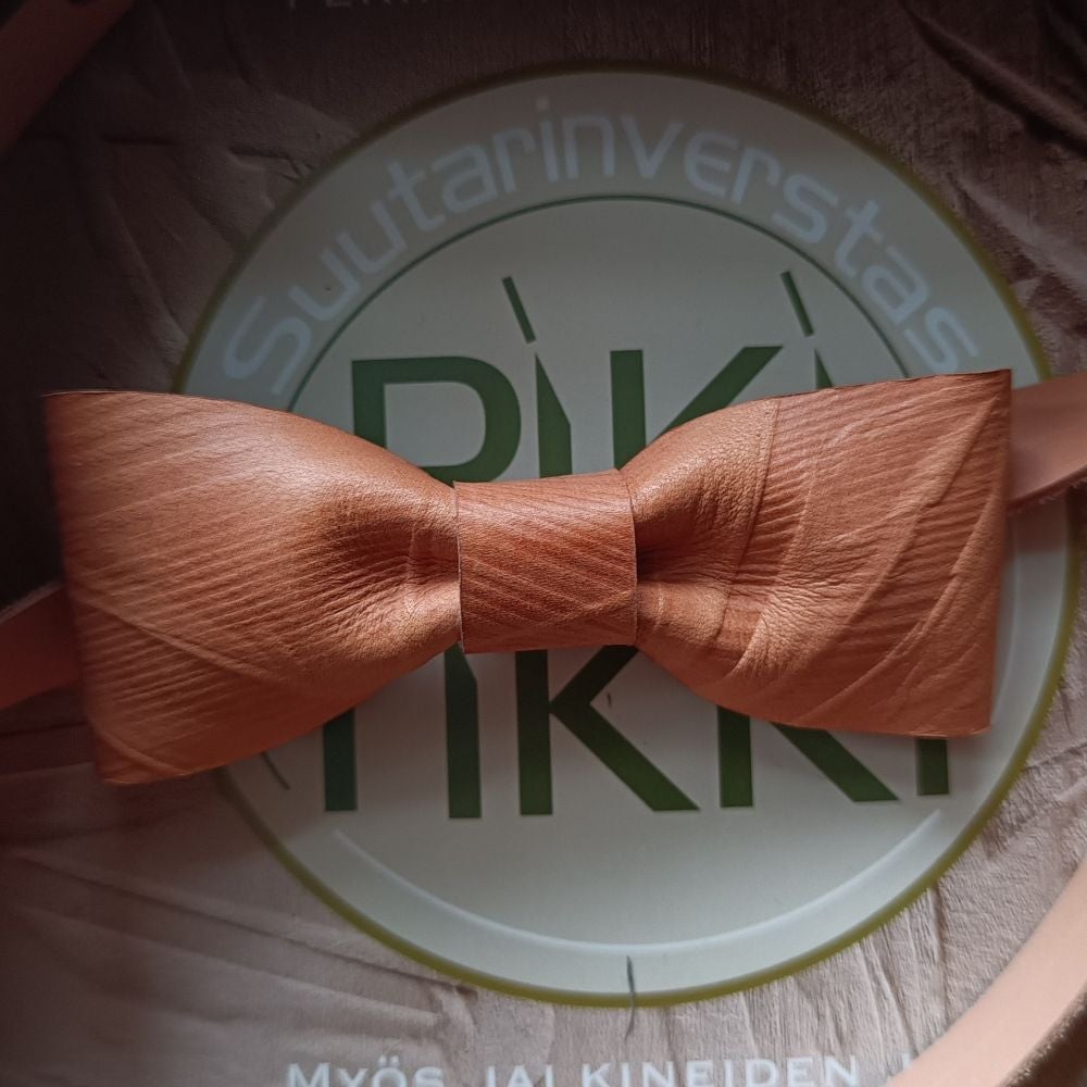 The Ihanuus bow tie is a small but striking detail. Each bow tie is unique: the leather is patterned using woodblocks that I have carved by hand, creating individual impressions for every piece. The leather is embossed while damp, allowing it to retain its shape beautifully as it dries.